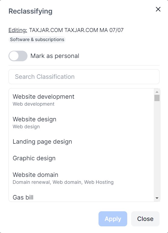 If you want to recategorize a transaction, you can do all of that from the Transactions page in our platform. Just click on the category and search for the correct description. You can also use the toggle to 'Mark as personal' so it doesn't impact your business results. See the screenshot below.